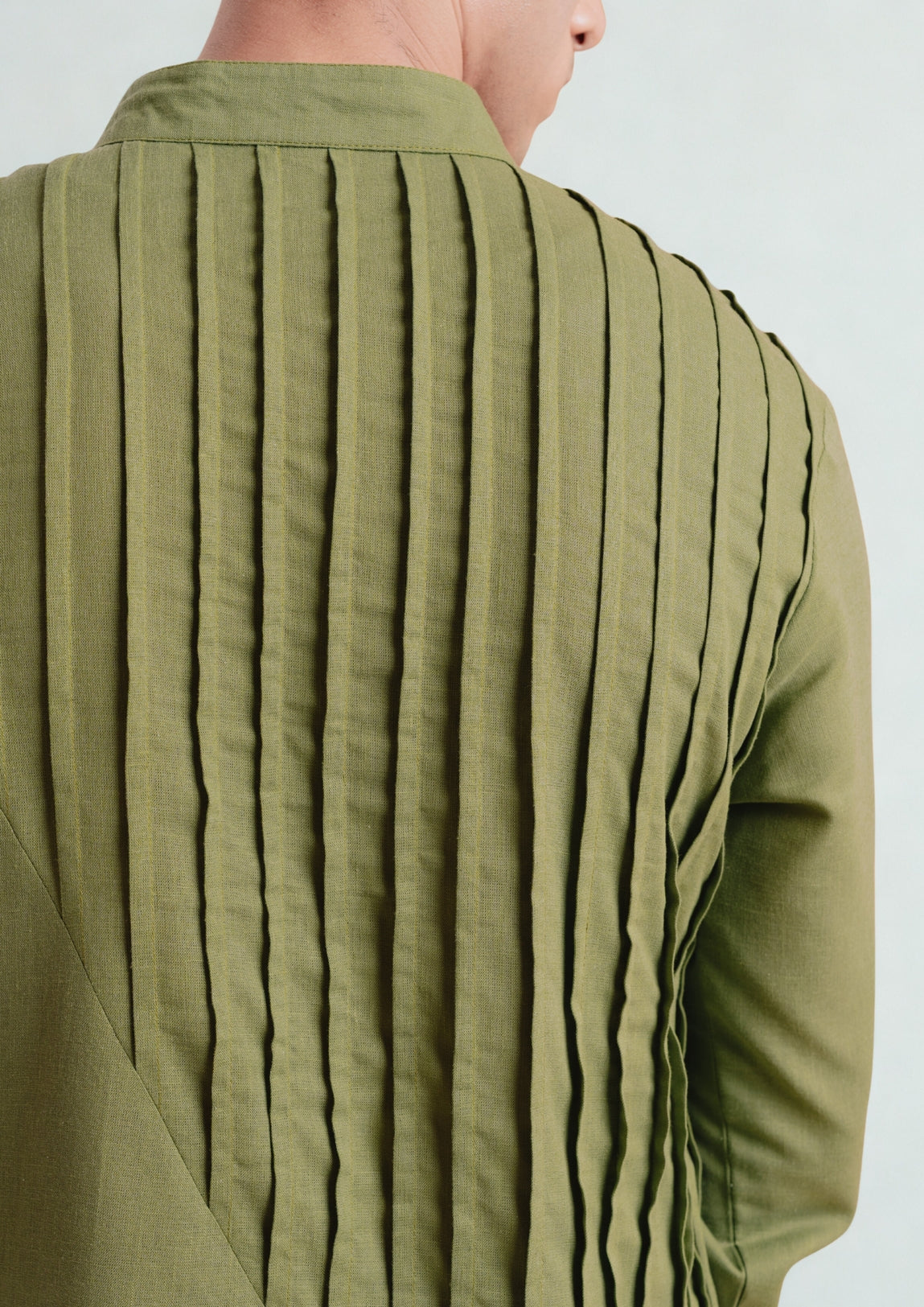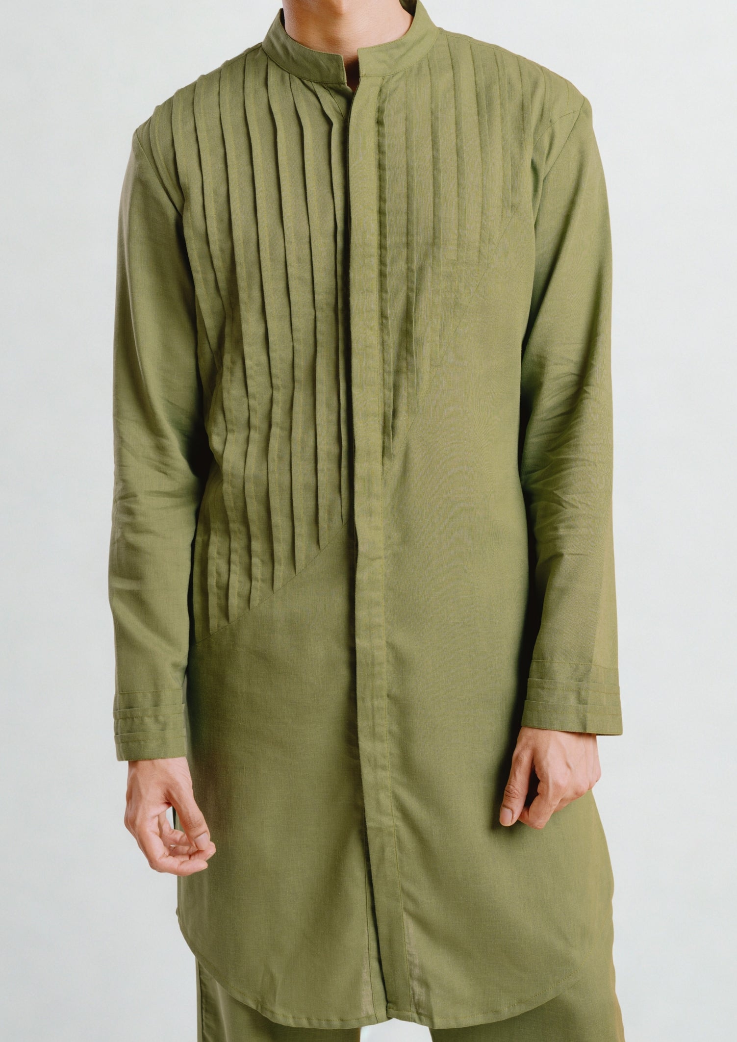 Crafted in breathable linen, this kurta set blends modern sophistication with timeless ease. Designed in a refreshing o green, the kurta features meticulous pintuck detailing that cascades down the front in a soft gradient manner, the same follows through to the back panel ,adding depth and texture to its minimal silhouette. The clean Chinese collar and concealed placket lend a refined finish, while the green linen straight-cut pants , featuring side pockets, a comfortable back elastic, and a tailored front waistband complete the coordinated look.
