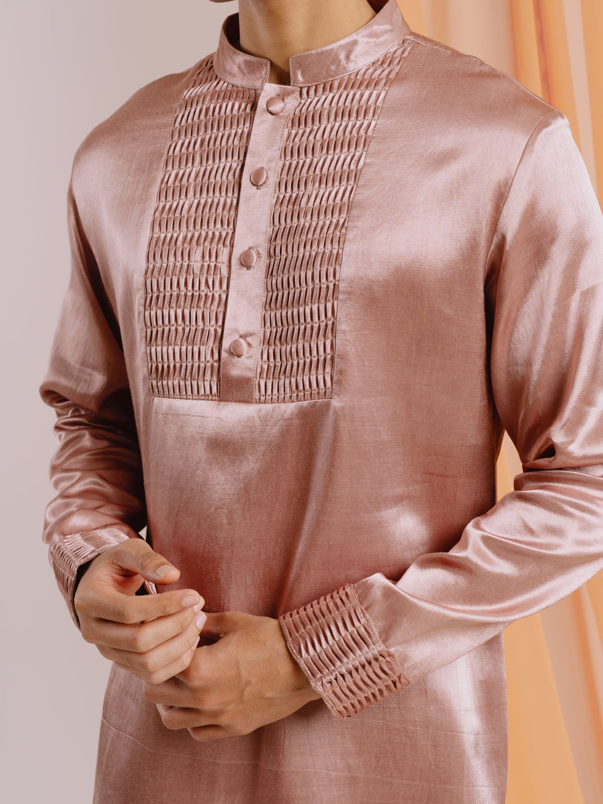 Effortless sophistication defines this mauve pink gajji silk kurta with a contemporary Chinese collar, straight cut hem and concealed pocket. Wave pin-tuck detailing on the yoke and cuffs creates a harmonious, refined look. Aired with ivory gajji silk pants featuring side pockets, a comfortable back elastic, and a tailored front waistband completing the look.